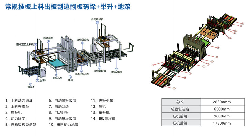 常規(guī)推板上料出板刮邊翻板碼垛+舉升+地滾